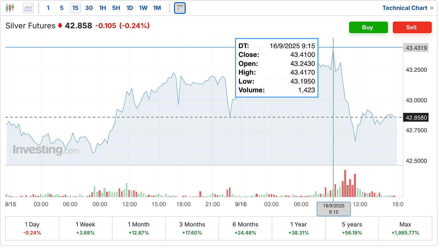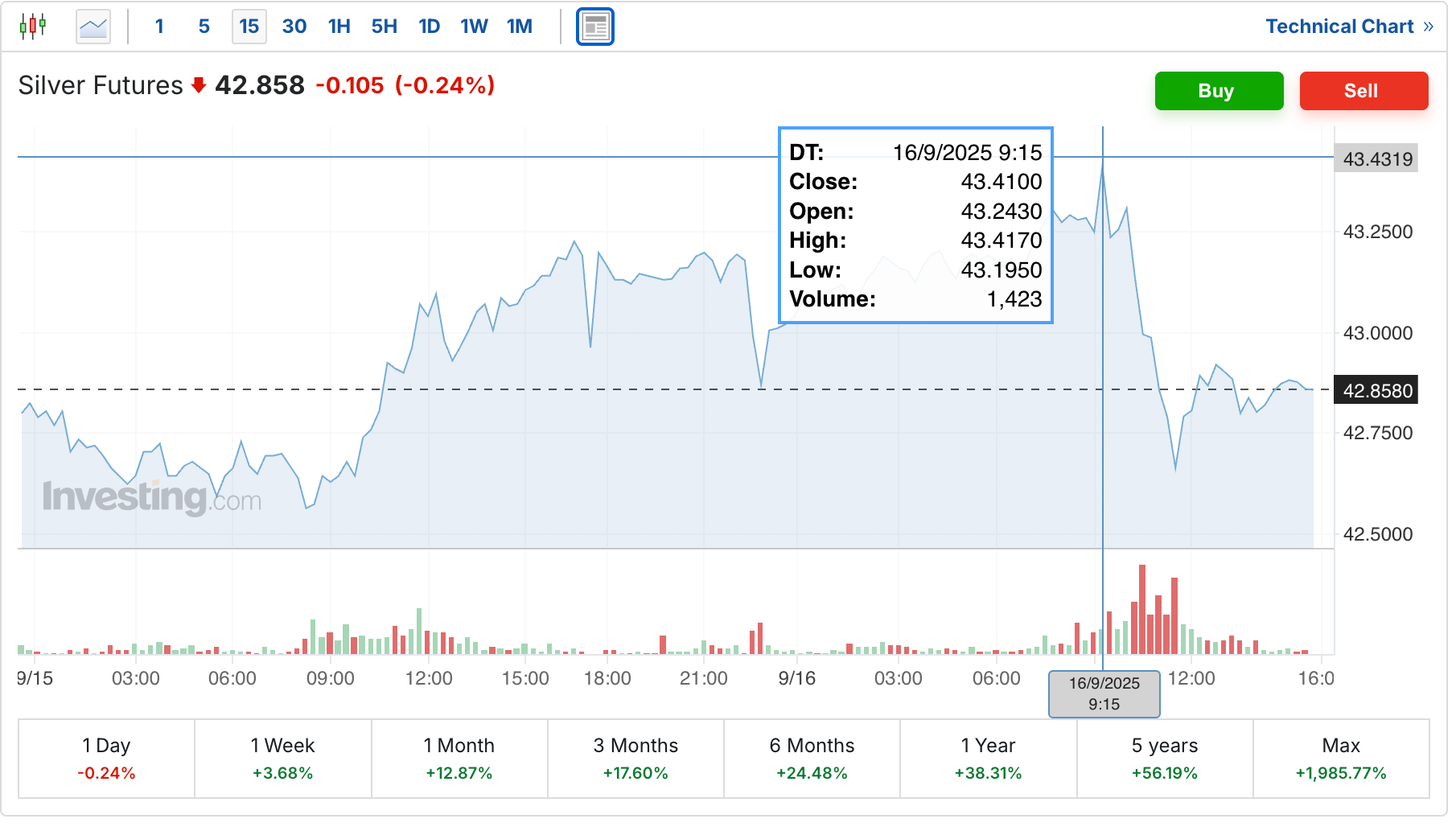 Next you can see how the silver futures had a sharp sell-off after reaching a new high for the current rally at $43.42.