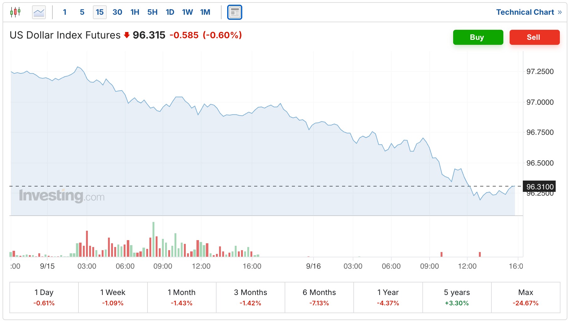 Also of note is that the dollar index was down even further today, dropping 58 points to 96.31.
