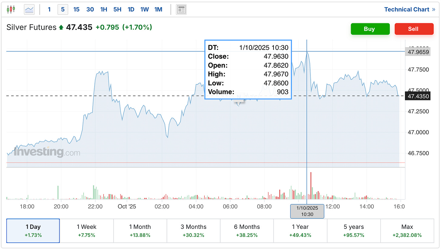Silver was off to another big day in the morning, with the futures reaching as high as $47.97, although they’ve since sold off down to $47.44.