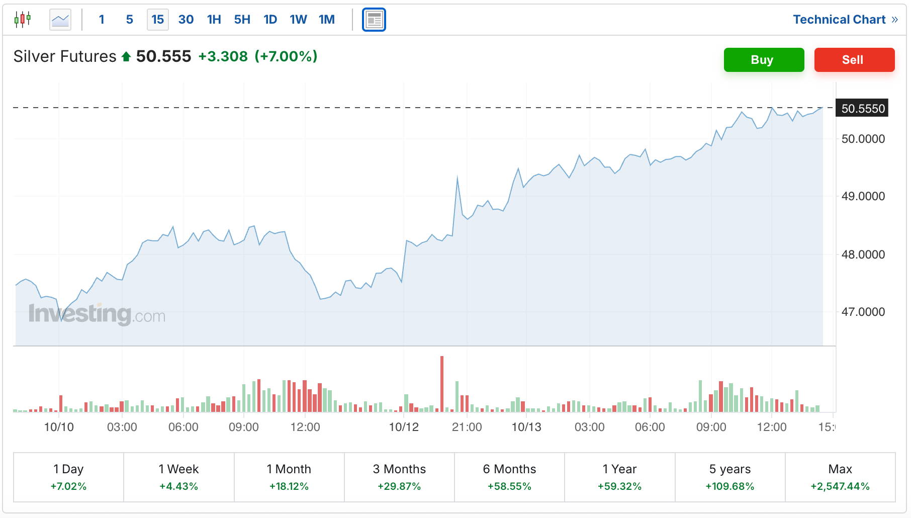 Here’s the chart of the silver futures, which are currently up $3.31 to $50.56.