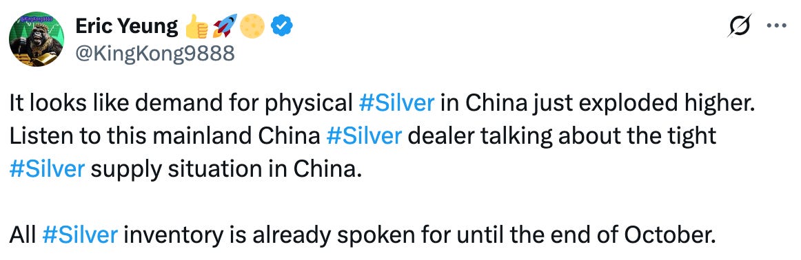 On Friday, I mentioned how Indian silver ETFs halted new purchases because there is currently a shortage of silver in India. To be clear, this is different than saying there’s an overall silver shortage, and in the report it was mentioned that they are expecting to receive a new shipment in the next week or two. So we’ll see if that gets resolved. But the surge in India’s silver imports in September placed additional pressure on the London silver market at a time when the available inventory was already low. And now you’re seeing the impact.