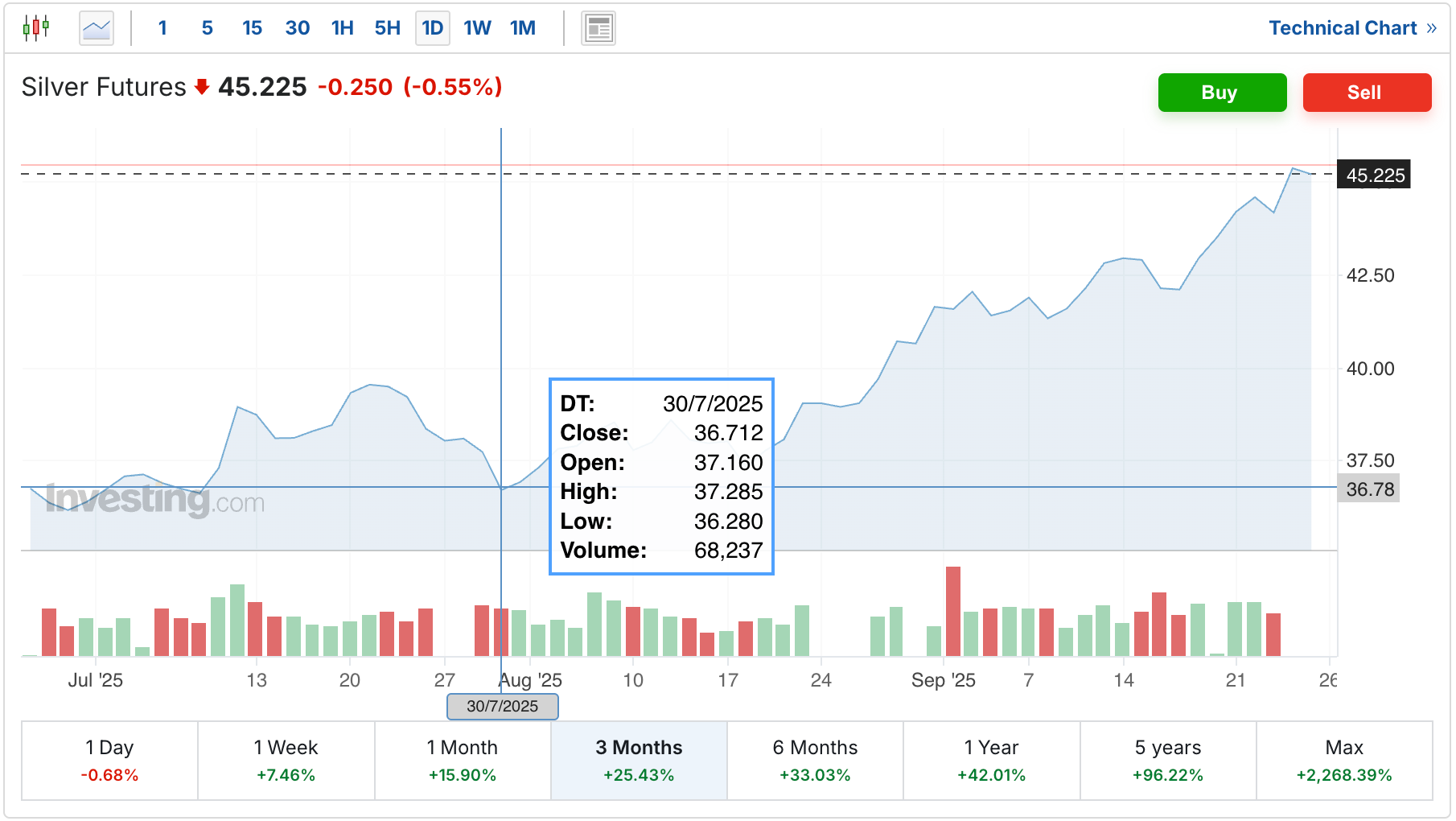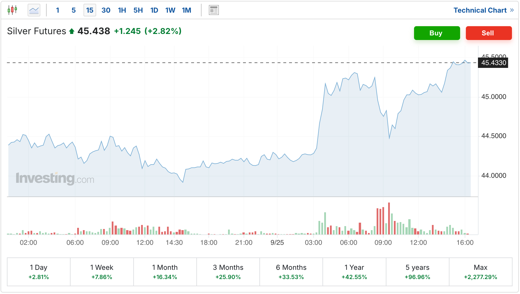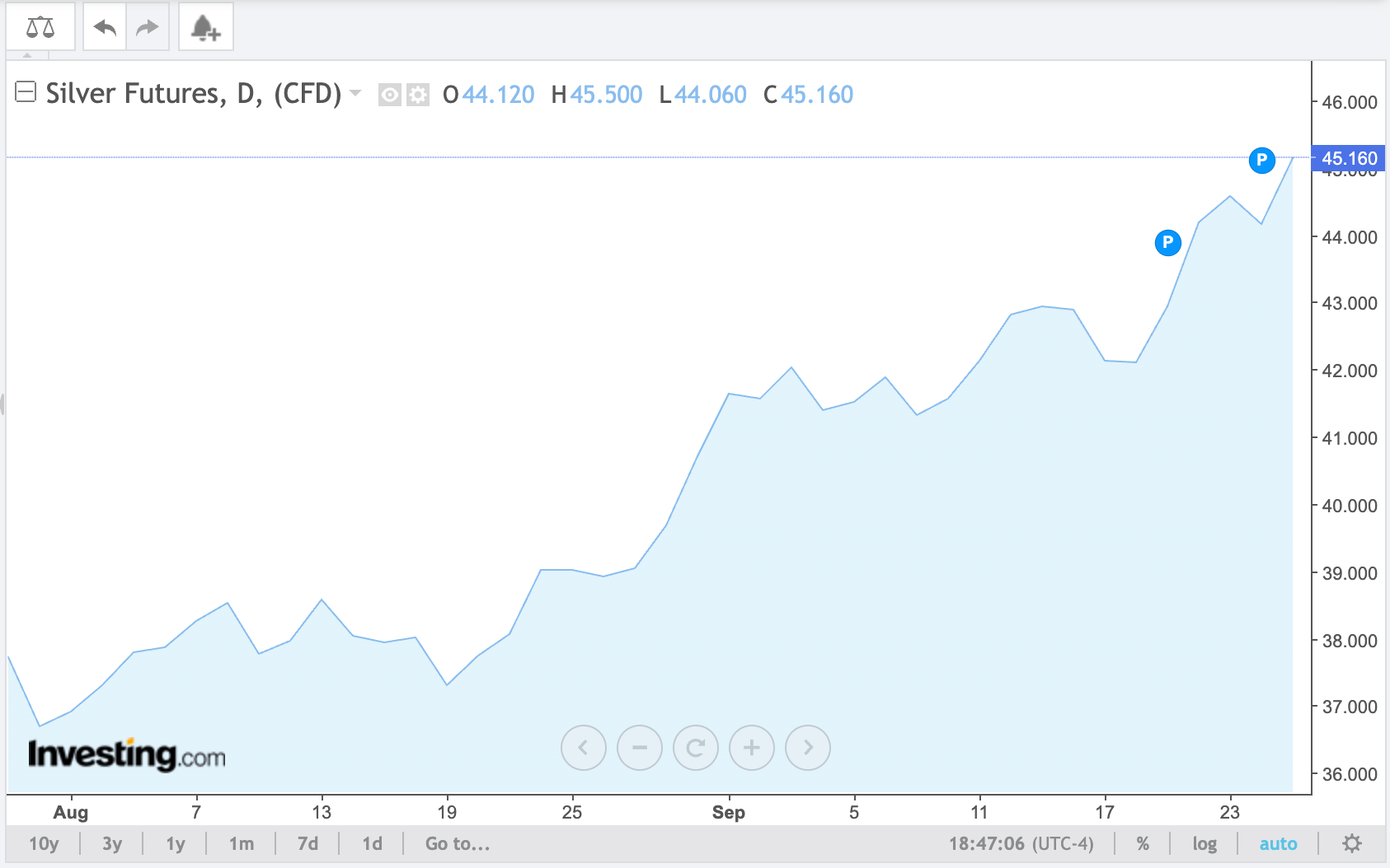 In another stunning day in the precious metals markets, the silver price surged above the $45 level for only the third time in history.