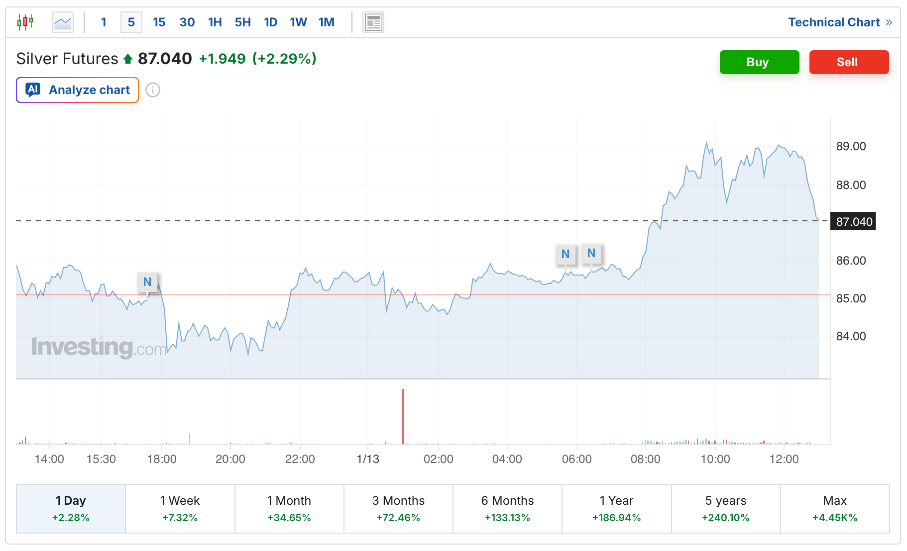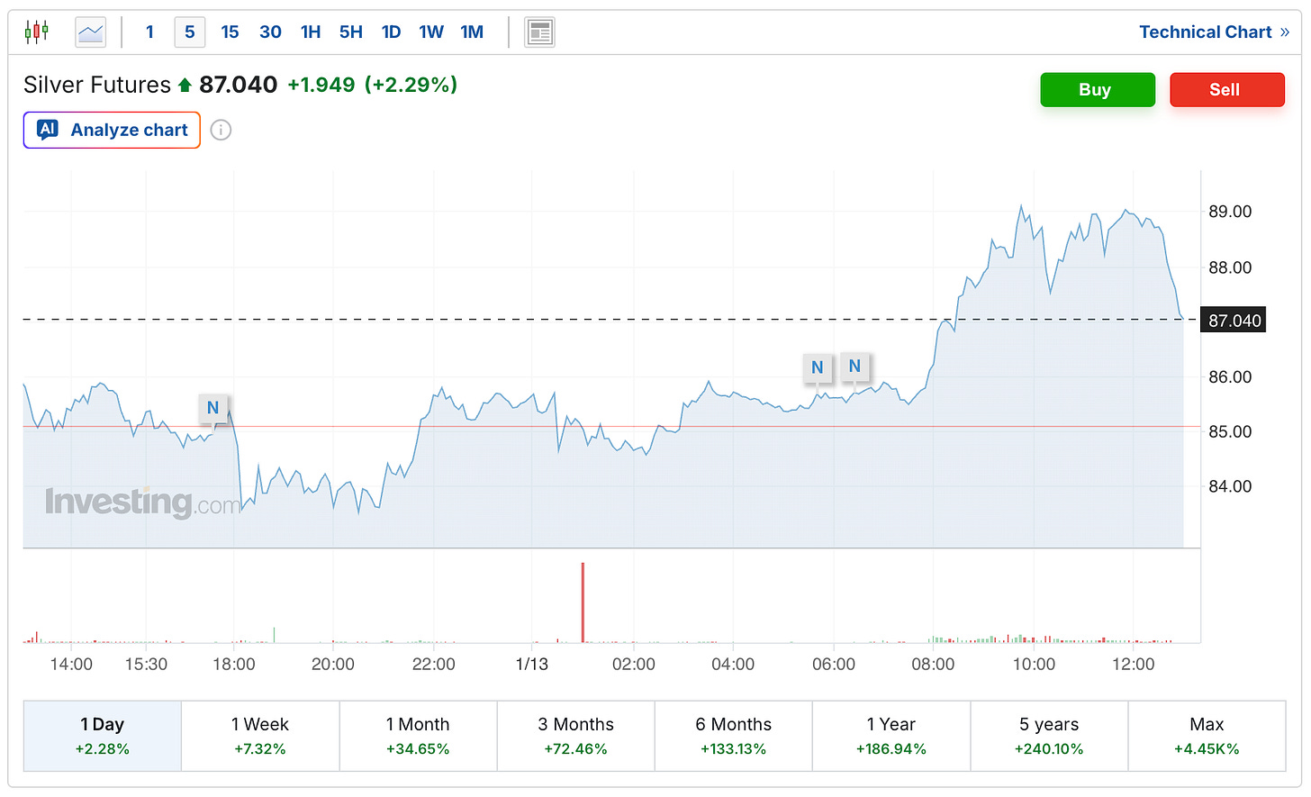 The silver futures are currently up $1.81 to $86.90, although both the futures and the spot price did cross over $89 per ounce earlier this morning before a sell-off over the last hour.