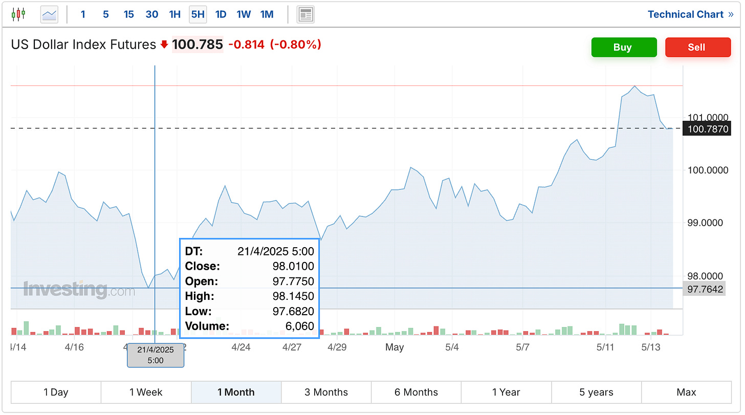 The silver move is particularly intriguing in the context of the recent rally in the dollar index, which has risen from below 98 on April 21, to 100.78 even after declining today.