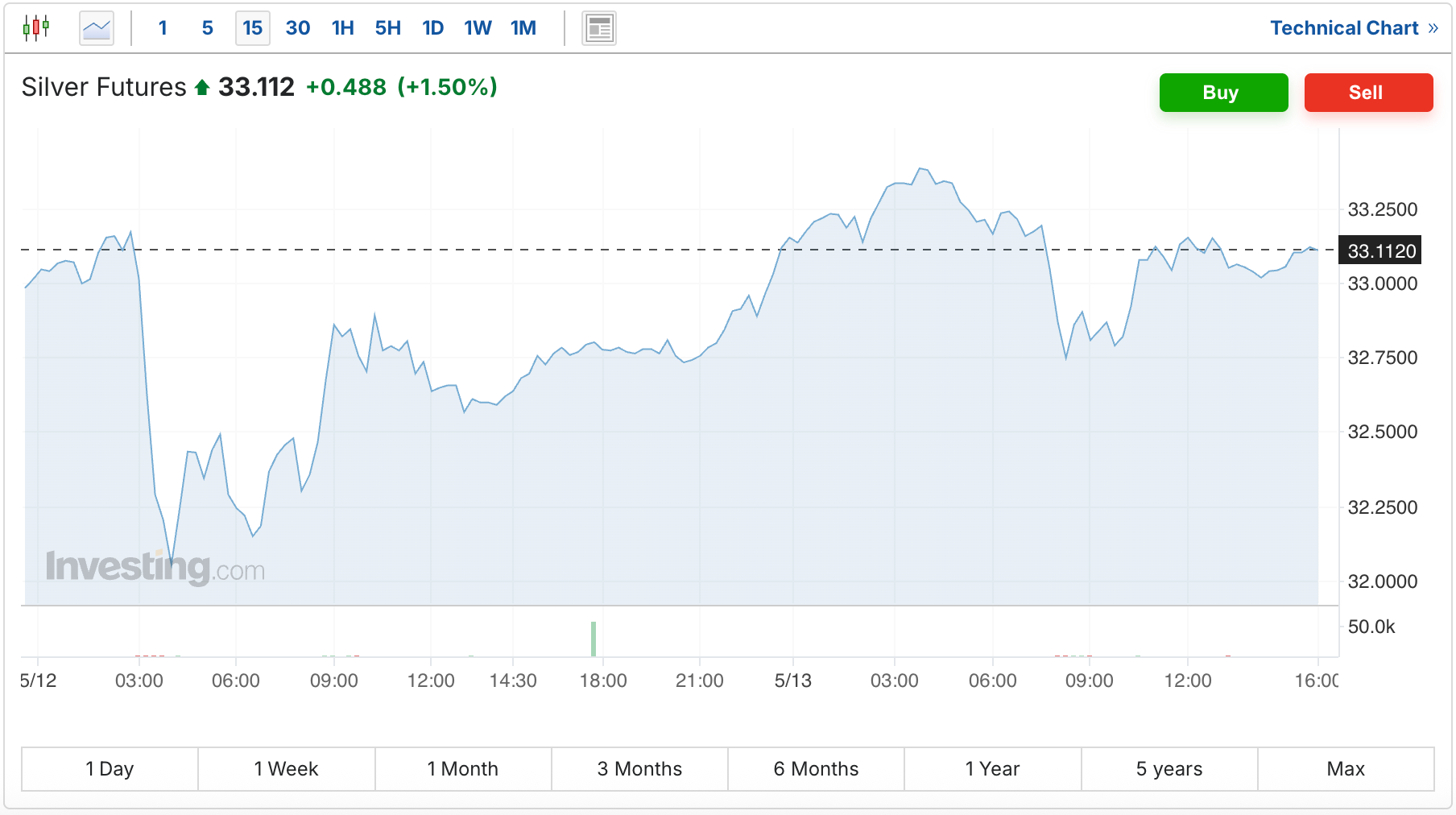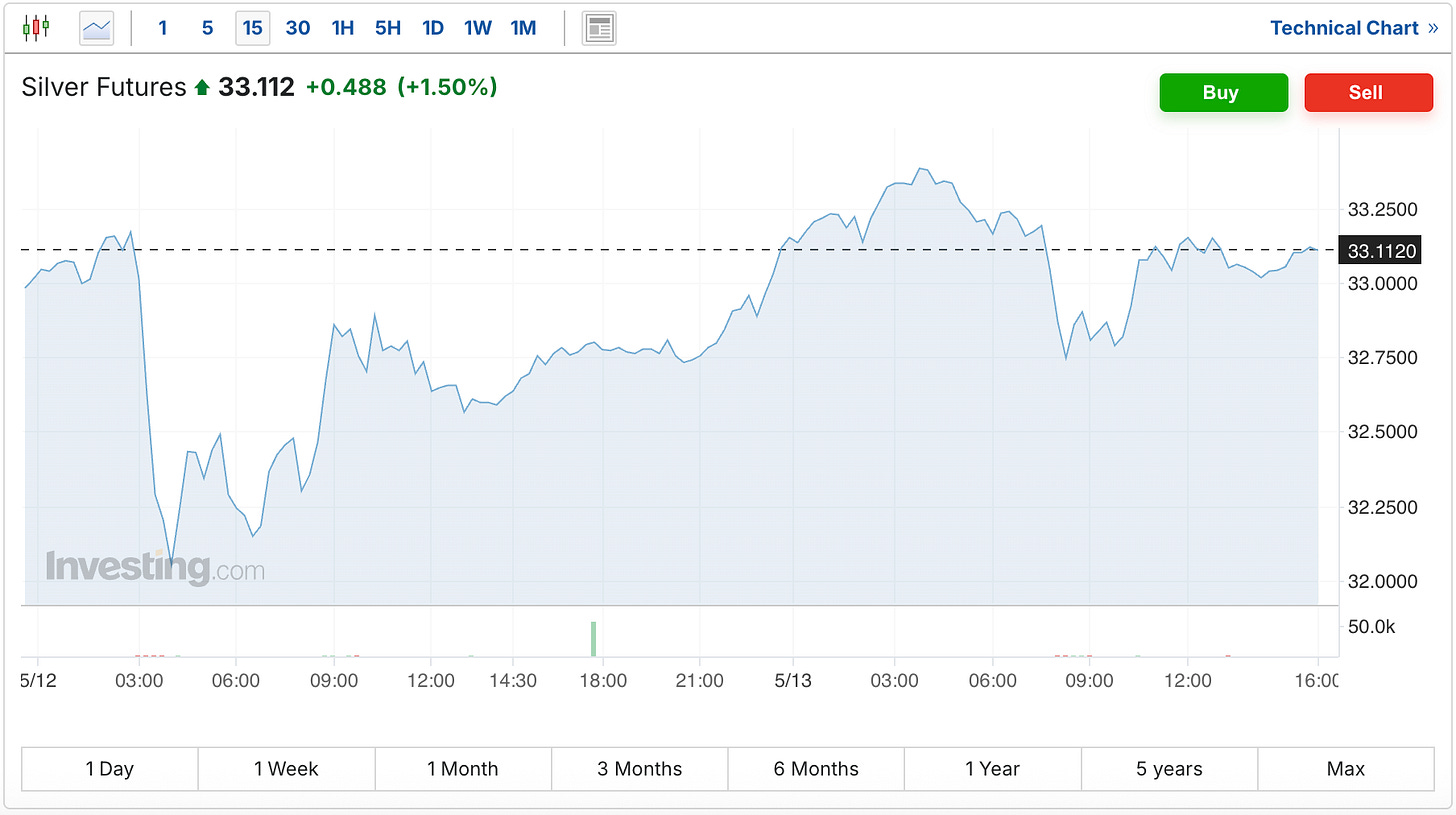 Meanwhile, the silver price is having a strong day, up 49 cents, and once again back over the $33 level.